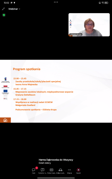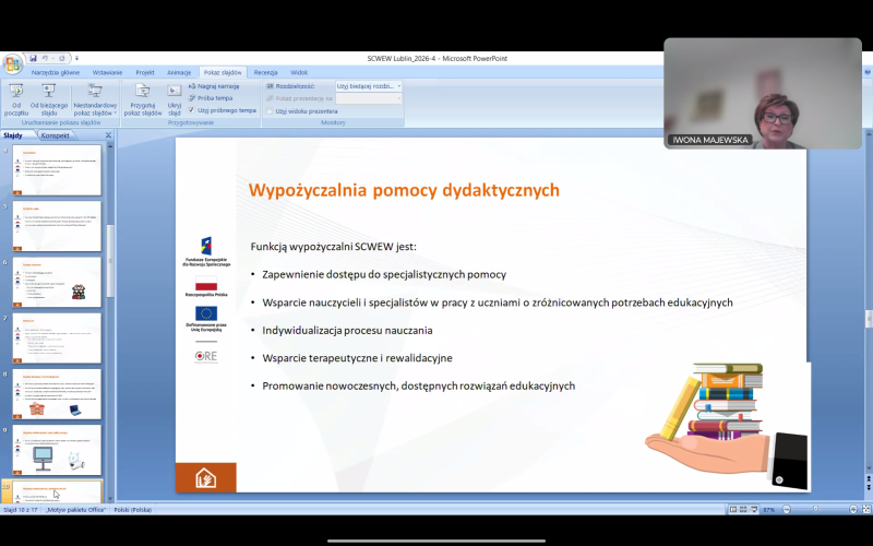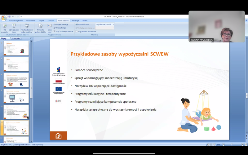 W ramach zaangażowania zespołów SCWEW w cykl działań upowszechniających IV edycję konkursu grantowego w dniu 4 lutego 2026r. liderka SCWEW w Lublinie wzięła udział, w roli prelegenta, we współpracy z operatorem III regionu Centrum Nowoczesnej Edukacji SCHOLAR, w spotkaniu informacyjno-konsultacyjnym. Tematem wystąpienia były „Zasoby przedszkola/szkoły/placówki specjalnej”.